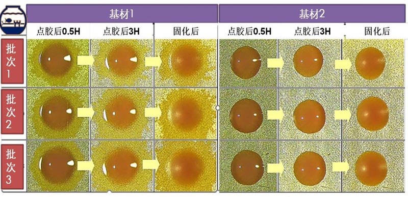 將膠粘劑點(diǎn)到基板或粘接界后,樹(shù)脂從膠粘劑中遷移出來(lái),在芯片周?chē)鷶U(kuò)散,形成澄清無(wú)色或者琥珀色的有機(jī)污染狀的環(huán)狀陰影,如上圖.