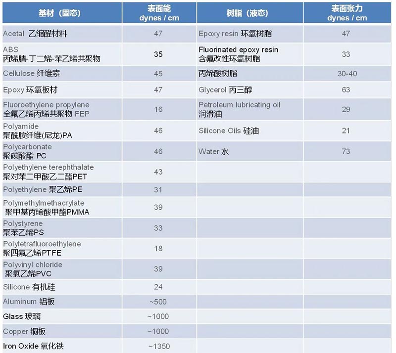 客戶端的工藝不同,選擇的粘接界面也會(huì)多種多樣,時(shí)常發(fā)生彼之蜜糖,我之砒霜(附上一些基板 和樹(shù)脂的表面張力數(shù)據(jù))