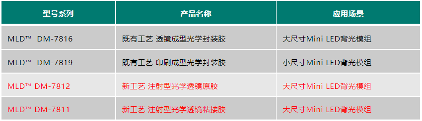 鏑普材料針對于Mini LED背光的顏色形成的技術(shù)難點,除了與客戶配套開發(fā)了當前既有工藝的MLD? DM-7816/7817系列Mini LED背光透鏡成型光學(xué)有機硅封裝膠和Mini LED背光印刷成型光學(xué)有機硅封裝膠等產(chǎn)品,也開發(fā)了新一代的Mini LED背光模組注射成型光學(xué)透鏡原膠MLD? DM-7812和相對應(yīng)的光學(xué)粘接膠MLD? DM-7811。相關(guān)產(chǎn)品利用光學(xué)膠粘劑成型的透鏡或者波導(dǎo)光傳輸原理,進行光學(xué)設(shè)計,以達到有效的聚光,解決光色不均勻性的問題,同時增加了背光正向的亮度。目前鏑普材料的相關(guān)產(chǎn)品均在頭部企業(yè)進行了驗證與交付。